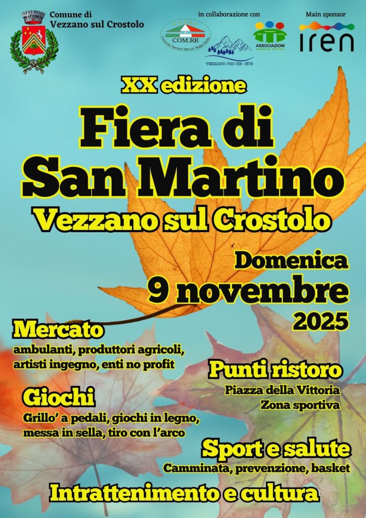 Mercato, prodotti della tradizione, musica, presentazione di libri, giochi, divertimento e ottimo cibo per la XX edizione della Fiera di San Martino – organizzata dall’Amministrazione Comunale in collaborazione con il Consorzio Operatori Mercati Reggio Emilia, Vezzano ProRE e le altre Associazioni vezzanesi ed avente come main sponsor IREN – manifestazione che tornerà ad animare l’autunno vezzanese domenica 9 novembre 2025.