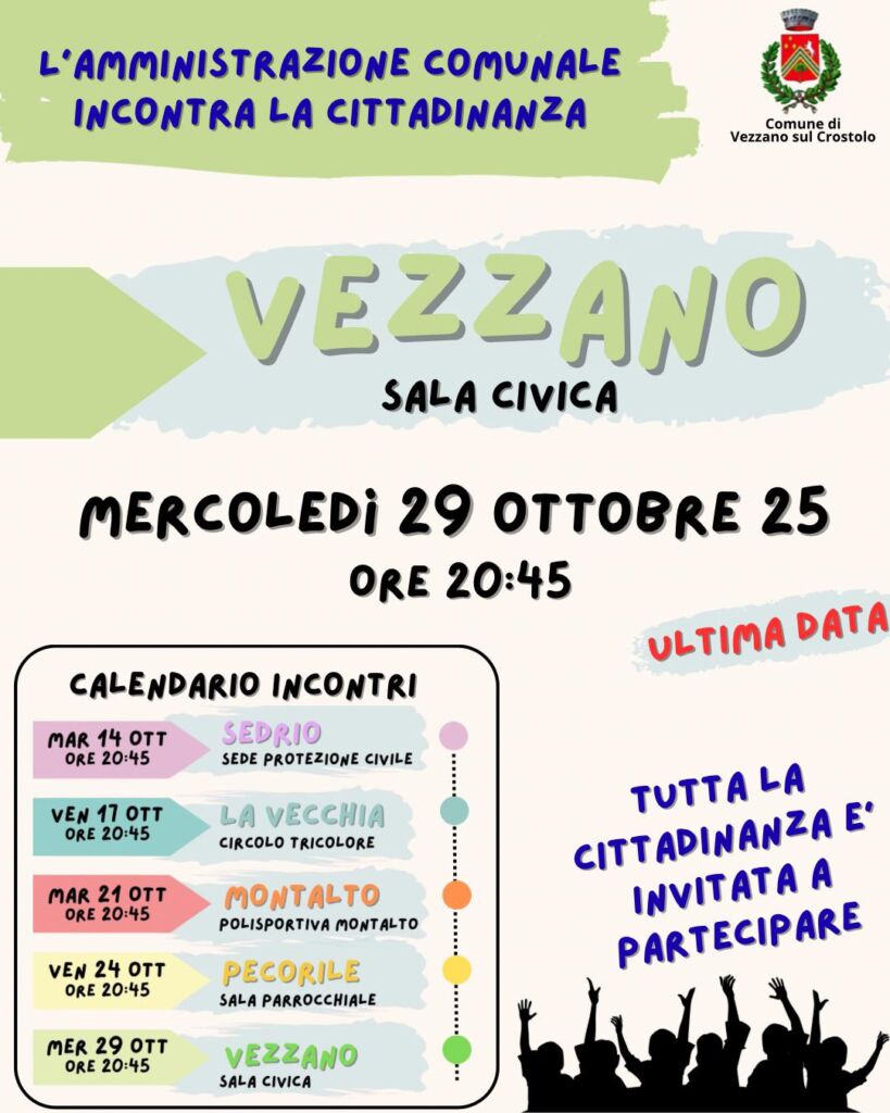 Terminano a Vezzano sul Crostolo, mercoledì 29 ottobre, gli incontri nelle frazioni del territorio promossi dall’Amministrazione Comunale. L’appuntamento è alle ore 20.45 nella Sala Civica del Municipio di Piazza della Libertà.
