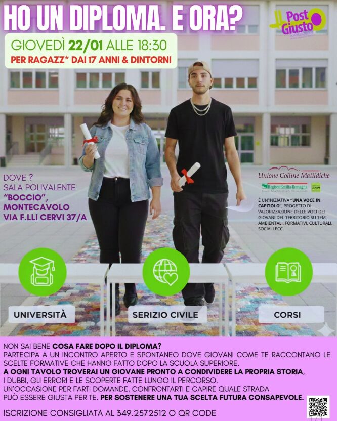 Non si sa bene cosa fare dopo il diploma? L’Informagiovani Infolavoro dell’Unione Colline Matildiche ha organizzato una serata aperta in cui ragazzi e ragazze si incontreranno per condividere la loro esperienza dall’università ai corsi della rete politecnica, dal lavoro, al tirocinio extra curriculare al servizio civile e tanto altro ancora.