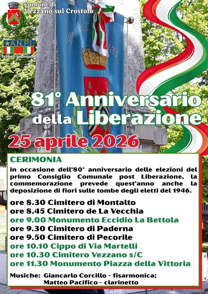 Sabato 25 aprile il Comune di Vezzano sul Crostolo celebrerà l’81° anniversario della Liberazione dal nazifascismo. La cerimonia commemorativa è organizzata dall’Amministrazione Comunale in collaborazione con la locale sezione di Anpi.