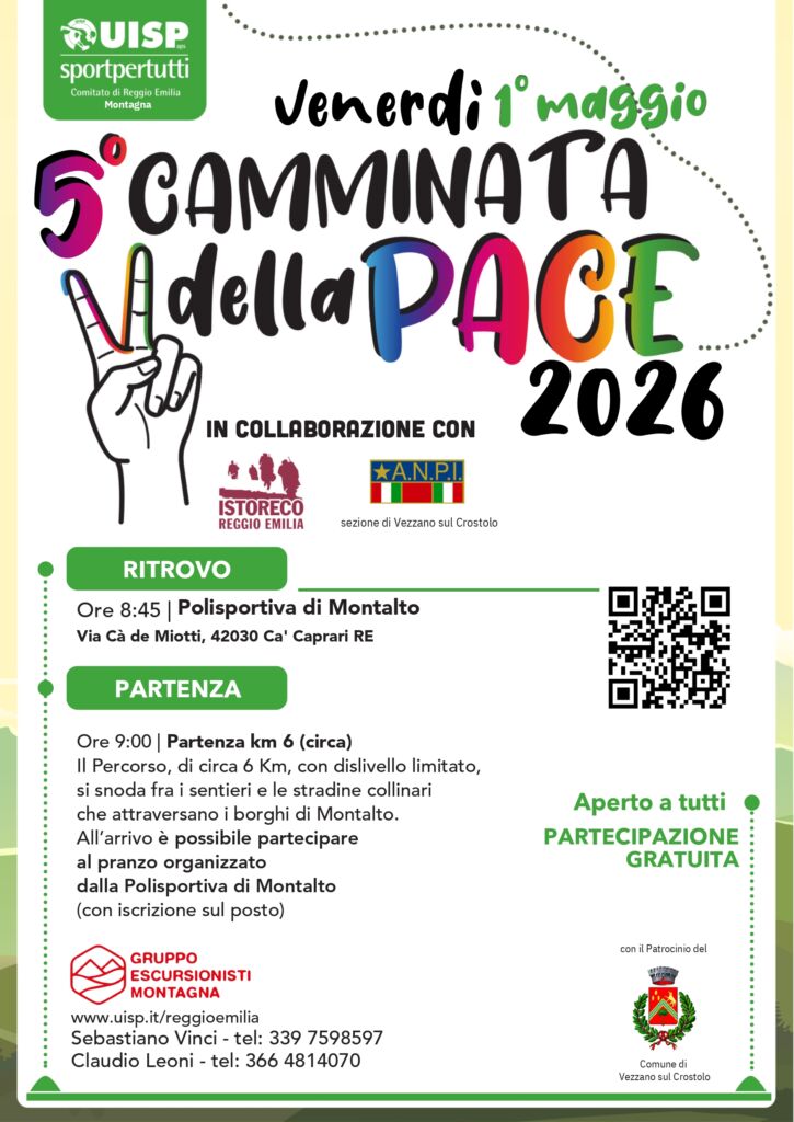 Venerdì 1° maggio torna la Camminata della Pace promossa da UISP Reggio Emilia – Gruppo Montagna in collaborazione con ANPI – Sezione di Vezzano sul Crostolo ed Istoreco, iniziativa patrocinata dall’Amministrazione Comunale di Vezzano sul Crostolo.