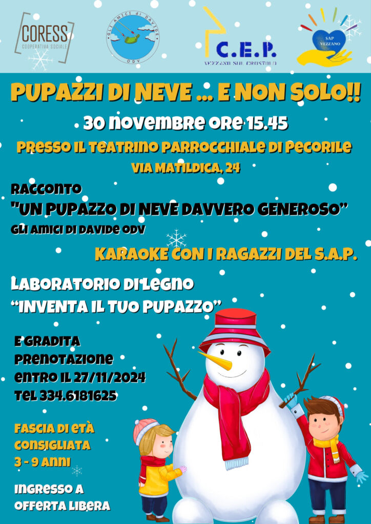 L’appuntamento per il pomeriggio di festa e musica “Pupazzi di neve … e non solo!” è per sabato 30 novembre alle ore 15.45 presso il teatrino parrocchiale di Pecorile (Via Matildica, 24).