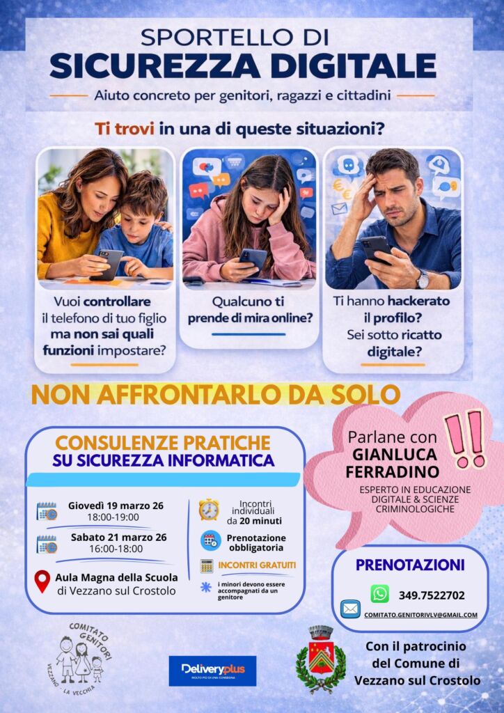 Per rispondere a queste e ad altre domande simili, a Vezzano sul Crostolo arriva uno sportello di consulenza sulla sicurezza digitale, dove genitori, insegnanti e anche i cittadini potranno confrontarsi direttamente con Gianluca Ferradino, esperto in educazione digitale e scienze criminologiche.